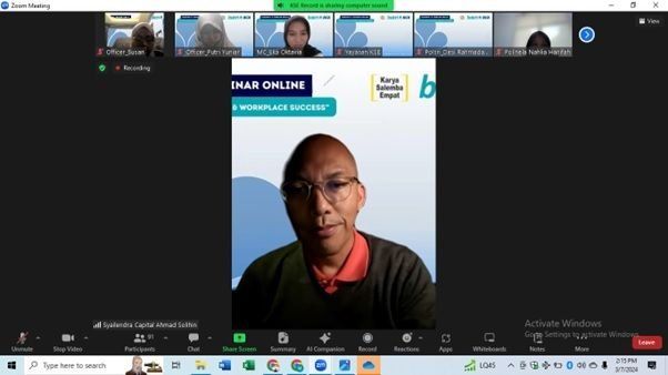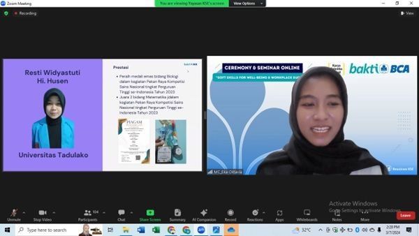 On Thursday, March 7 2024, PT BCA Tbk held a “Ceremony & Seminar” with the theme “Soft Skills For Well-Being & Workplace Success” via the Zoom platform. This event was attended by 120 students from 35 KSE partner PTNs starting at 14.00 WIB until 17.00 WIB, with the aim of helping participants strengthen the soft skills needed to achieve success in the workplace and in everyday life. This activity also aims to encourage and prepare scholarship recipients to become graduates who have integrity, have a national outlook, and have the capacity and competence to become potential leaders in the future.