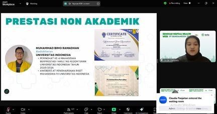 Entering the core material, in this seminar the material was delivered by Mrs. Adisty Ghaisani Muthi’ah as People Development Specialist at PT Bundamedik Tbk. The material presented was about mental health, especially for today’s young generation, with the theme “Mental Health to become a more positive person”. Mrs. Adisty delivered the material communicatively to the participants so that the participants actively asked questions using the chat box feature in the zoom meeting.