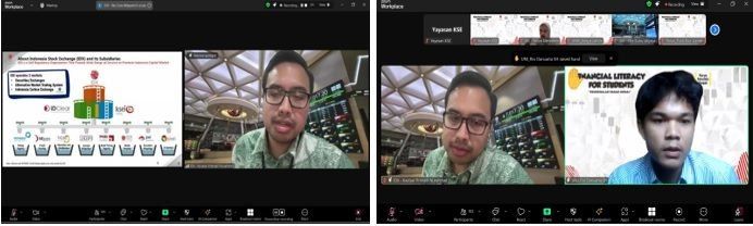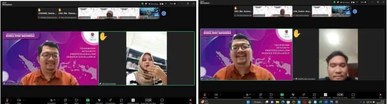 The material session on the introduction of capital delivered by Teja was closed with questions and answers together with the participants. Students who had the opportunity to ask questions were Zavira from USK Genta from Andalas University, and Rio from UNJ. The questions raised by the participants formed an interesting discussion about the capital market with Teja.