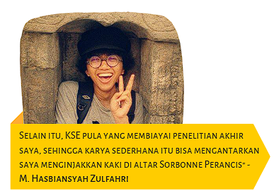 “Adanya beasiswa KSE, membuat biaya kebutuhan bulanan saya terjamin. Saya bisa lebih fokus mengembangkan diri lewat keilmuan, organisasi, dan pemberdayaan masyarakat. Hasil dari itu, saya berkesempatan menjuarai berbagai perlombaan dan mendirikan socio-entreprise“.